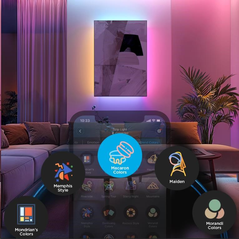 Pokročilý DIY režim LED Strip Light 2 Pro umožňuje vytvářet vlastní světelné efekty, zatímco desítky přednastavených scén vám poskytují okamžitou inspiraci pro různé příležitosti – od relaxačního večera po energickou párty. Každá scéna je navržena tak, aby maximálně využila možnosti plynulých přechodů barev a dynamických efektů. Se 16 miliony barev si můžete hrát s nekonečnými kombinacemi, které se dokonale přizpůsobí jakékoli atmosféře. Synchronizace s hudbou navíc zajišťuje, že světla oživí každý rytmus a zvýší zážitek z poslechu.