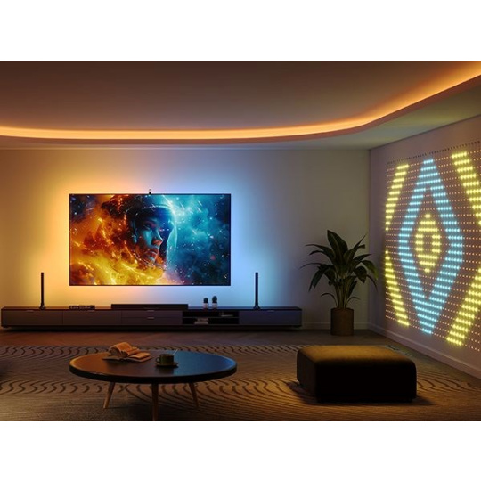 Govee vám přináší sadu toho nejlepšího pro dokonalý vizuální zážitek ze sledování televize. Sada Led pásků Backlight 3 Lite a 38cm LED panelů je kompletním řešení pro scénické osvětlení zdi za televizní obrazovkou a vedle ní, které vás doslova vtáhne do děje. Díky diodám s technologií 4 v 1 RGBICW u panelů i pásku a hustotou 30 diod na 1 metr pásku, dosahuje světlo ohromující intenzity, kontrastu a bohatosti barev. Řešení je s celkovou délkou pásku 3,6 m určeno pro televizory s úhlopříčkou 55–65 palců, tedy pro nejoblíbenější rozměry. Životnost diod je až 50.000 hodin, takže nemusíte mít strach, Backlight 3 Lite je navíc vybaven detekcí zhasnuté obrazovky a automaticky světla vypíná při ukončení sledování, to je pohodlné, ale hlavně energeticky šetrné. Zásadním vylepšením ale je projekce pomocí replikace obrazu na TV obrazovce pomocí kamery. Ta se velmi jednoduše připevňuje nad TV a na zeď promítá přesně barvy v přesném rozložení, aby byl zážitek co nejlepší. Díky technologii Govee DreamView Sync můžete navíc TV světlo synchronizovat s dalšími až 7 Govee zařízeními. Backlight 3 je kompatibilní s Google Home a Amazon Alexa asistenty, nainstalujete ho za pár minut díky 3M samolepícím páskám. Backlight 3 Lite vám opticky zvětší úhlopříčku vaší televize, dopřejte si opravdové domácí kino.