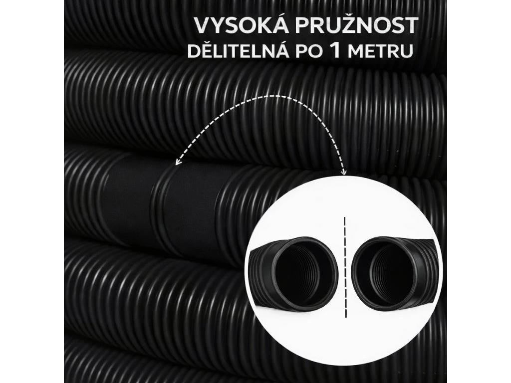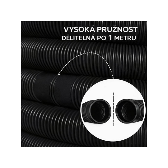 Bazénová hadice průměru 38 mm je určena k propojení filtrace s bazénem a dalším bazénovým příslušenstvím (např. vysavač, vakuová hlava, tepelné čerpadlo, solární ohřev apod.). Hadice je vcelku dlouhá 6 m, dělitelná po 1,0 m. Barva: černá Vnitřní průměr hrdla: 38 mm Délka 1 dílu: 1,0 m Materiál: HDPE + LDPE Max. teplota vody: 40 °C Balení: kartonová krabice.