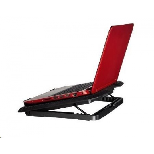 - chladicí stojan pro notebook - pohodlné pracovní podmínky díky šikmé poloze notebooku - ventilátor s modrým LED podsvícením - stabilní umístění díky pogumované spodní části - nízká spotřeba (šetří akumulátor notebooku) - napájení přes USB - velmi nízká provozní hlučnost Technické parametry: - pro notebooky s úhlopříčkou 34 až 40 cm (13,3“ až 15,6“) - hlasitost: 23 dBA - počet ventilátorů: 2 - odběr proudu (USB): 320 mA - rozměry: 27 x 3 x 37 cm - hmotnost: 802 g - barva: černá.