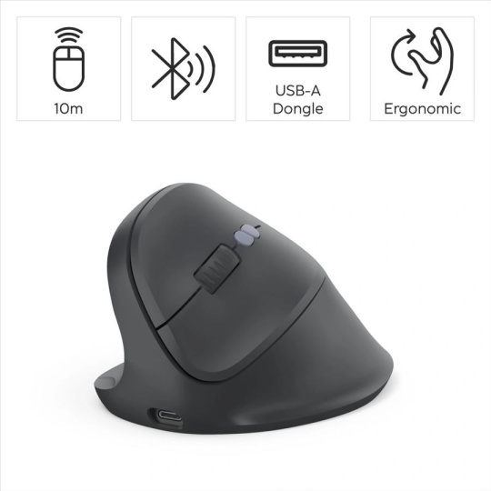 - 8tlačítková ergonomická bezdrátová optická myš s volitelným připojením na tři zařízení: 1x bezdrátový USB přijímač a 2x Bluetooth - vertikální provedení předchází namožení a bolesti ramen a zápěstí - ergonomický tvar vhodný pro leváky - integrovaný akumulátor, nabíjení pomocí USB-C kabelu - tichá, bez zvuků při klikání pro nerušenou práci - DPI tlačítko pro změnu rozlišení (800/1200/1600 DPI) - nano USB přijímač můžete přenášet v těle myšky - aktivace AI asistenta v systému tlačítkem - tlačítka s funkcí zpět/vpřed v prohlížeči - pogumované rolovací kolečko - polymerové kluzné plochy - samostatný vypínač pro úsporu energie - 2,4 GHz technologie pro spolehlivý a nerušený přenos signálu s dosahem až 10 m - tělo a tlačítka jsou vyrobena z 85% z recyklovaného ABS plastu - balení je 100% bez plastů Systémové požadavky: - běžné funkce: Windows 11/10, Mac OS 11 nebo novější - tlačítko Assist: Windows 11 s aplikací Microsoft Copilot Technické parametry: - připojení: USB-A vidlice (RF 2,4 GHz), Bluetooth 5.2 - počet tlačítek: 8 včetně rolovacího kolečka - rozlišení: 800/1200/1600 DPI - napájení: integrovaný Li-Ion akumulátor - konektor nabíjení: USB-C zásuvka - délka nabíjecího kabelu: 1,8 m - rozměry: 8,6 x 11,5 x 7,1 cm - hmotnost: 95 g - barva: černá Obsah balení: - myš EWM-600R - USB-A přijímač - nabíjecí kabel USB A-C (1,8 m) se stahovací páskou - návod k použití.