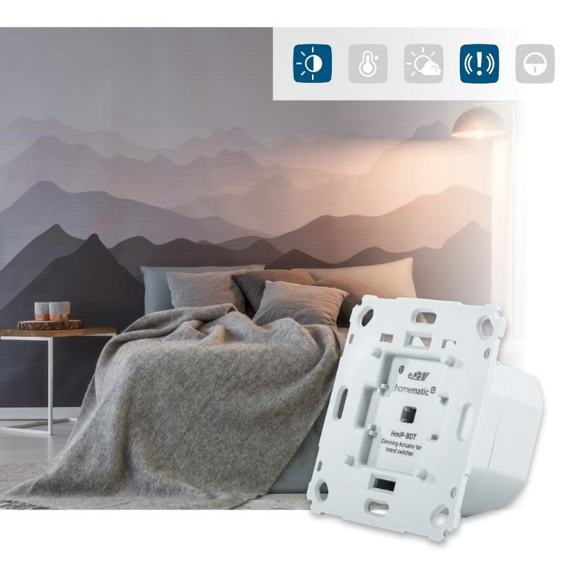Stmívací akční člen (HmIP-BDT) se montuje do standardní zápustné krabice pod omítku s připojením do sítě 230 V. Bezdrátová komunikace nabízí možnost instalace bez potřeby druhotné kabeláže. To znamená, že akční člen lze umístit v místě připraveného nebo stávajícího elektrického rozvodu sítě 230 V.