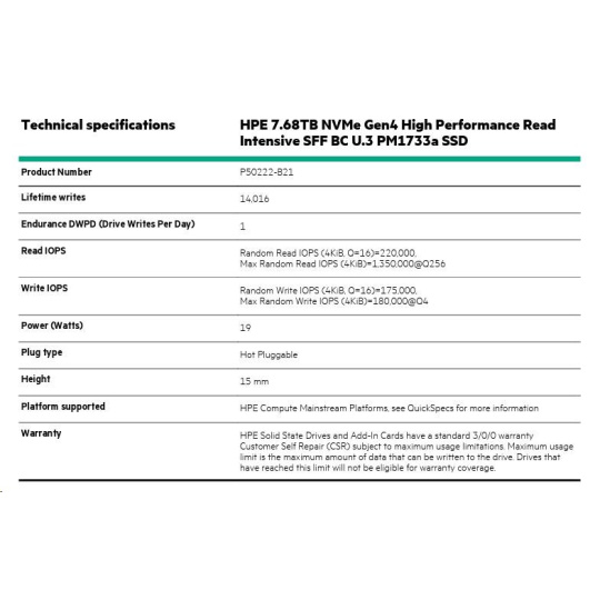 HPE 7.68TB NVMe Gen4 High Performance Read Intensive SFF BC U.3 PM1733a SSD P50222-B21 RENEW