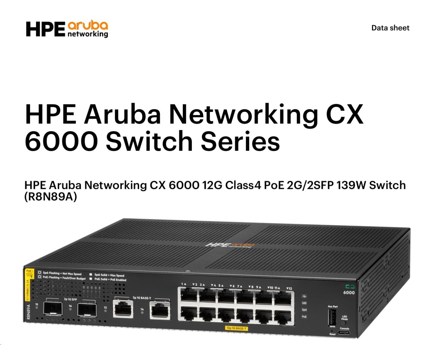 HPE Aruba Networking CX 6000 12G Class4 PoE 2G/2SFP 139W Switch (R8N89A)