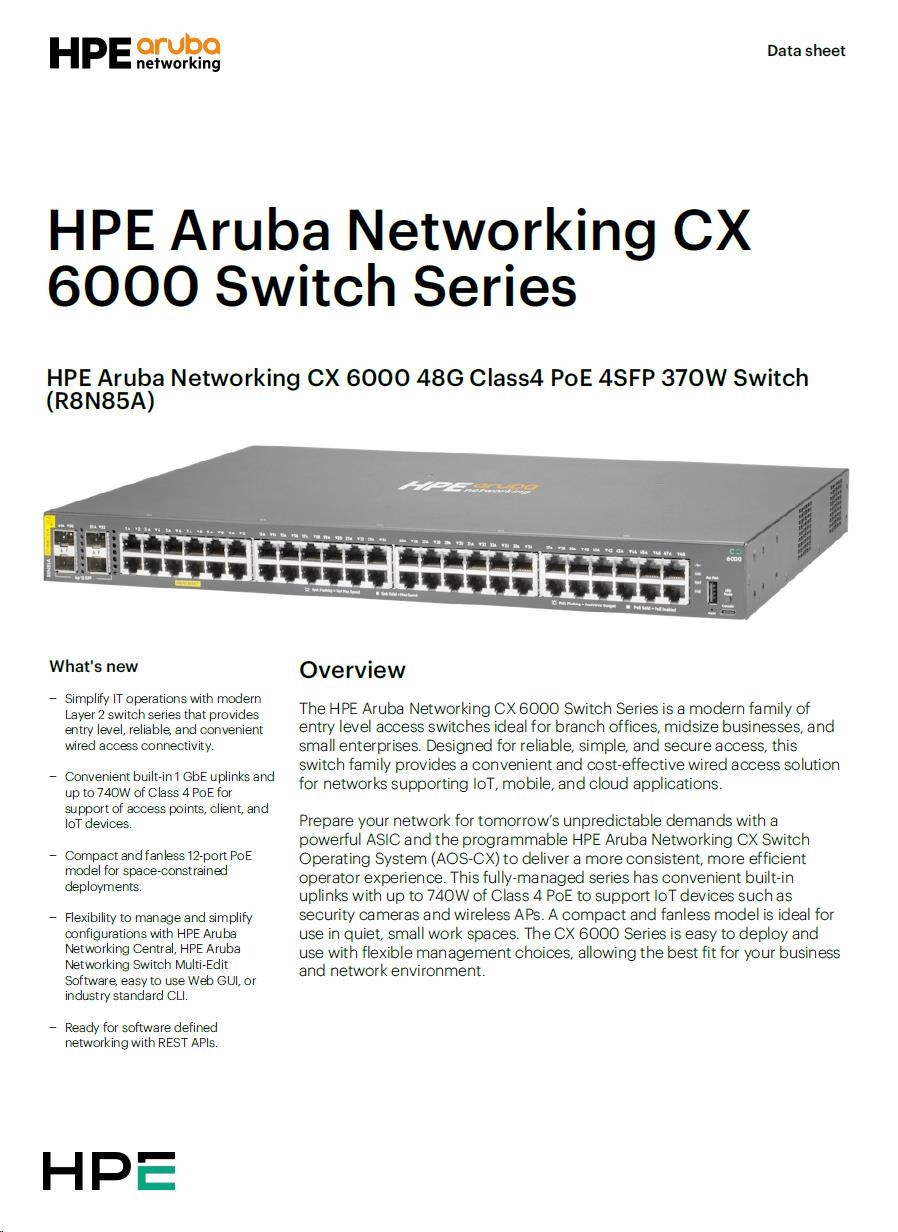 Aruba 6000 48G Class4 PoE 4SFP 370W Switch (R8N85A) | Aruba 6000 48G 4SFP Switch (R8N86A) | Aruba 6000 24G Class4 PoE 4SFP 370W Switch (R8N87A) | |