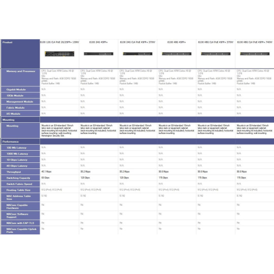 Provedení:Rack mounted 19"; Funkce:L2, L3; Technologie:Gigabit Ethernet 1000Mbps, 10 Gigabit optika, Gigabit ethernet + 10 Gigabit optika, Gigabit optika; Počet portů LAN:48; Podporované standardy PoE:Žádný; Počet PoE Out portů:0; Počet SFP portů:4; Počet SFP+ portů:4; Ventilátor; Maximální počet portů:52; Počet USB 2.0:2; Latence 1Gb/s (mikrosek.):1.8.... více