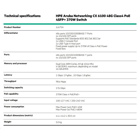 HPE Aruba Networking CX6100 48G Class4 PoE 4SFP+ 370W Switch JL675A