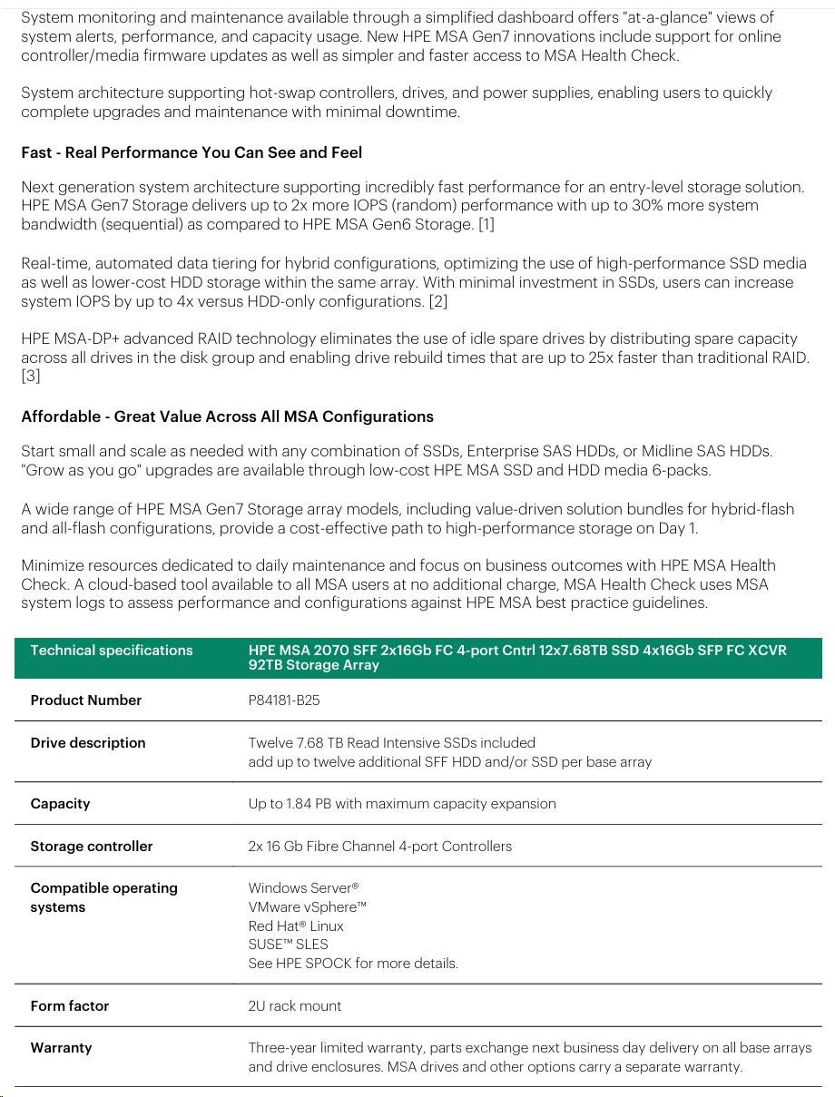 HPE MSA 2070 SFF 2x16Gb FC 4-port Controller 12x7.68TB SSD 4x16Gb SFP FC XCVR 92TB Storage Array Smart Choice.