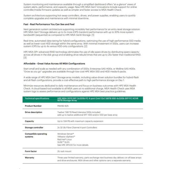 HPE MSA 2070 SFF 2x32Gb FC 4-port Controller 12x7.68TB SSD 4x32Gb SFP FC XCVR 92TB Storage Array Smart Choice.