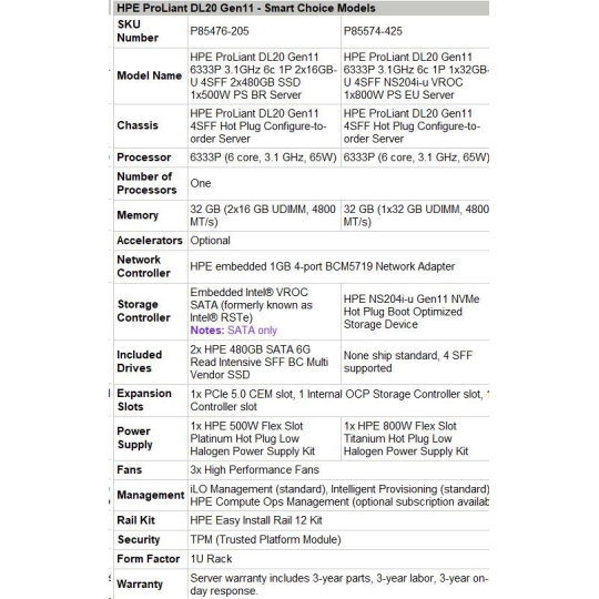 HPE PL DL20g11 6333P (3.1G/6C12T) 1x32G (P64339) NS204(2x480G) 4SFF VROC 1x800W 4x1G NBD333 Smart Choice