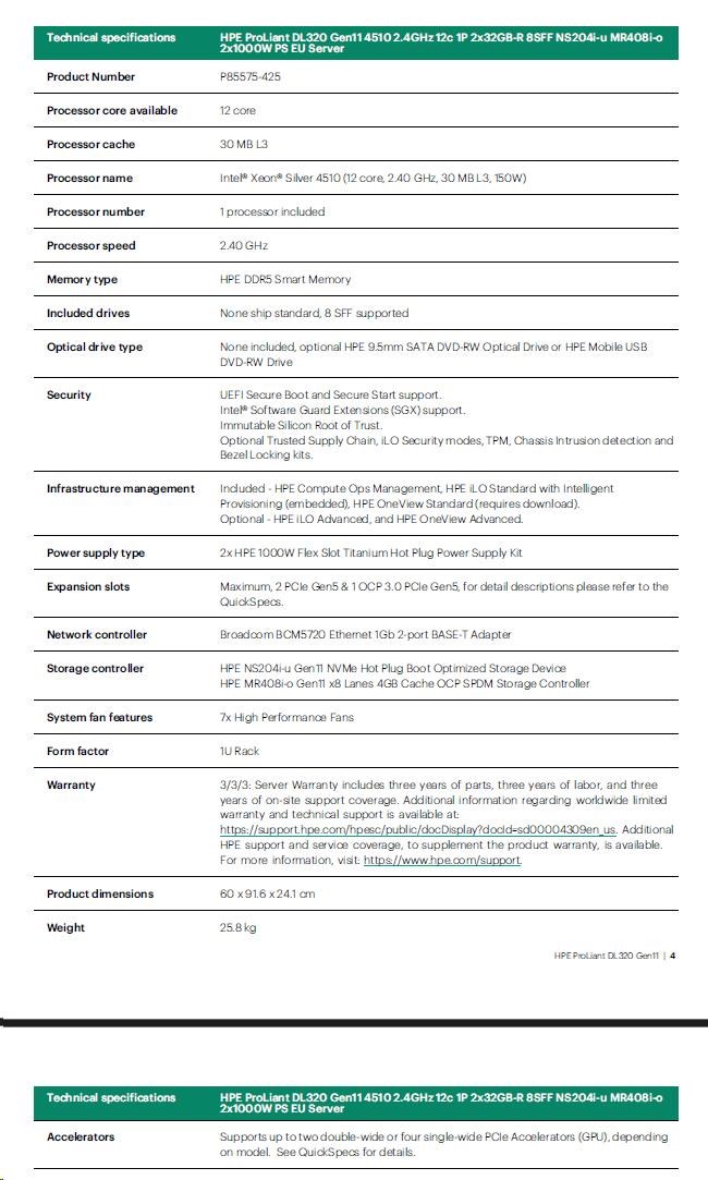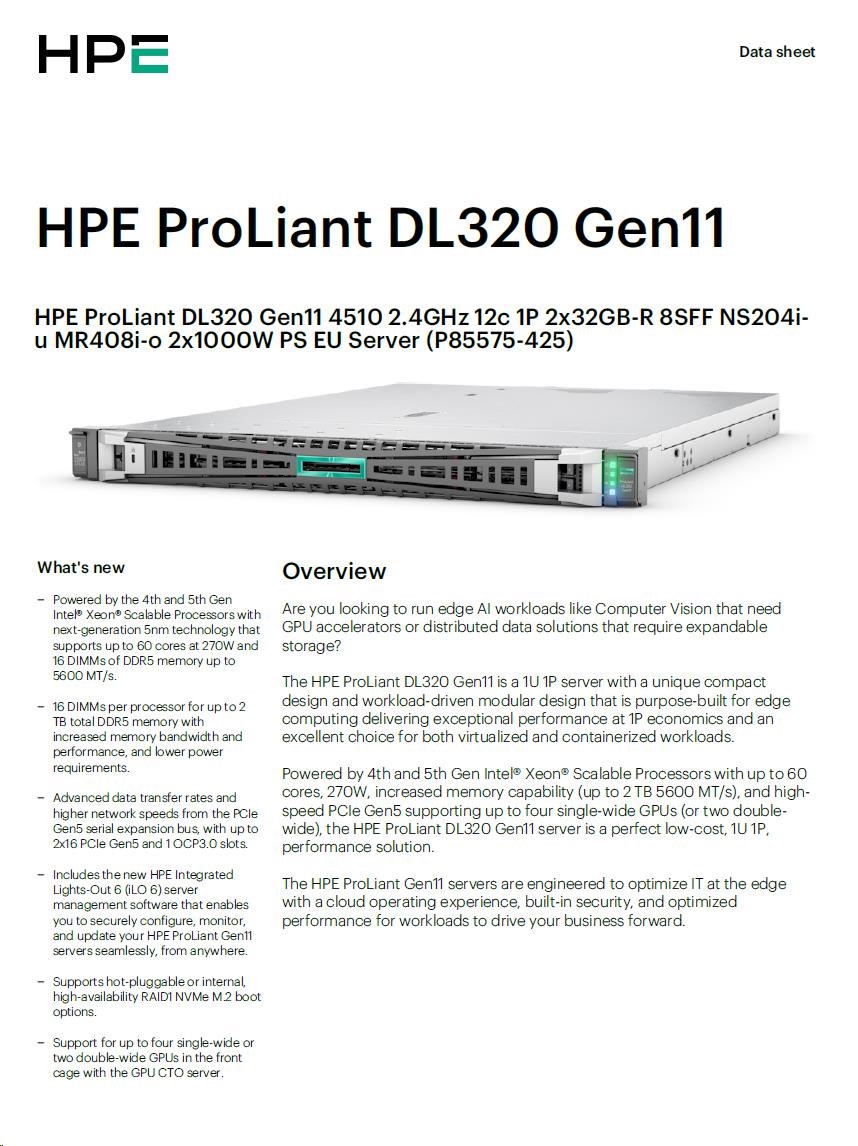 HPE PL DL320g11 4510 (2.4/12C) 2x32G (p64706) NS204(2x480) MR408i-o 8SFF 2x1000W 2p1G Smart Choice.