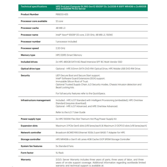 HPE PL DL360 Gen12 6505P (2.2/12C) 2x32G (P69727) 2x480G MR408i-o 8SFF 2x1000W 10GbE NBD333 Smart ChoicePE ProLiant Compute DL320 Gen12 Datasheet