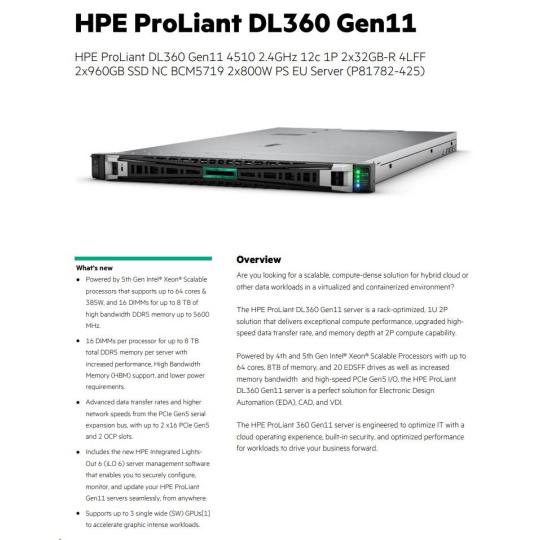 HPE PL DL360g11 4510 (2.4G/12C) 2x32G 2x960G VROC 4LFF LPC 2x800W 4x1G Smart Choice.