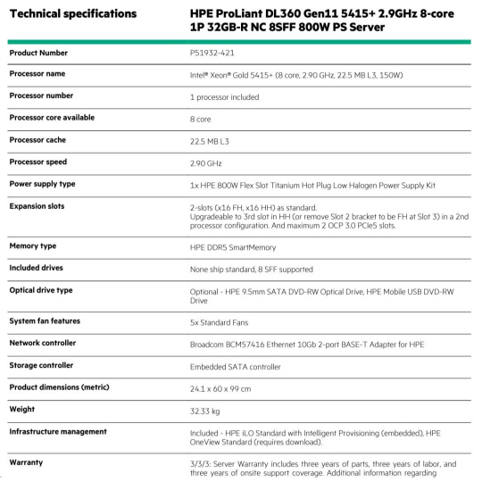 Model Name HPE ProLiant DL360 Gen11 5415+ 2.9GHz 8-core 1P 32GB-R NC 8SFF 800W PS Server