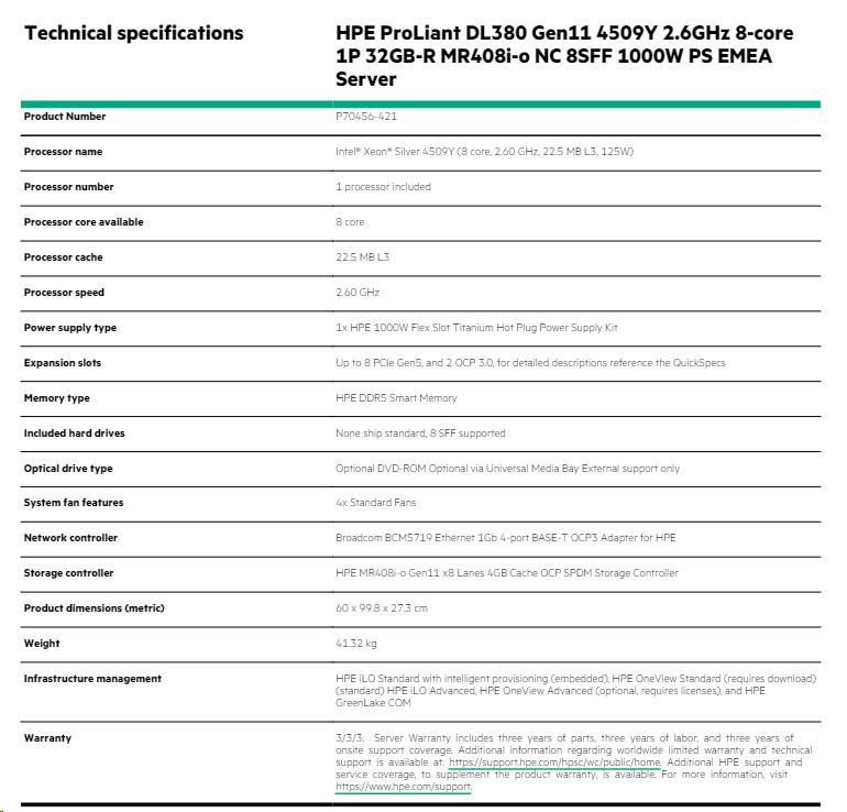 3/3/3: Server Warranty includes three years of parts, three years of labor, and three years of onsite support coverage. Additional information regarding worldwide limited warranty and technical support is available at: https://support.hpe.com/hpsc/wc/public/home. Additional HPE support and service coverage, to supplement the product warranty, is available. For more information, visit https://www.hpe.com/support.