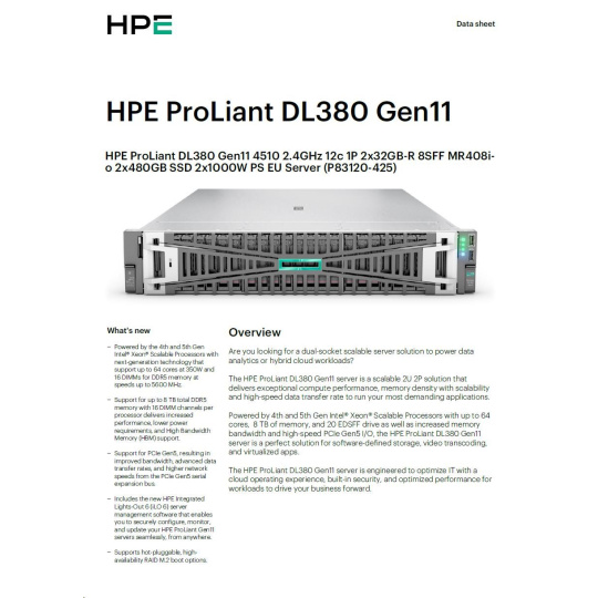 HPE PL DL380g11 4510 (2.4G/12C) 2x32G (p64706) 2x480G 8SFF MR408i-o 2x1000W 4p1To Smart Choice