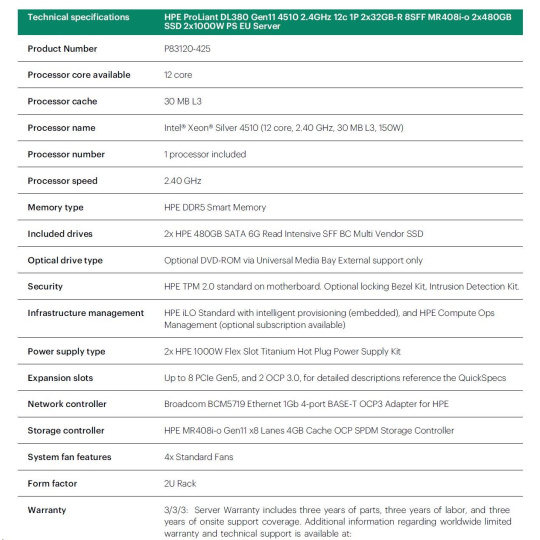 HPE PL DL380g11 4510 (2.4/12C) 2x32G (p64706) 2x480G 8SFF MR408i-o 2x1000W 4p1To Smart Choice.