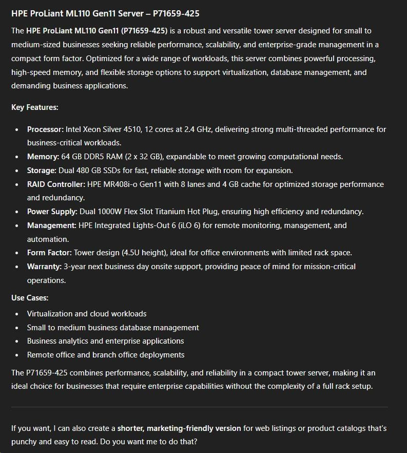 | Model Name | HPE ProLiant ML110 Gen11 4510 12-core 1P 64GB-R MR408i-o 8SFF 2x480GB SSD 2x1000W RPS EU Server |