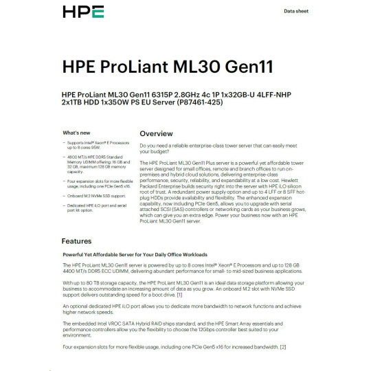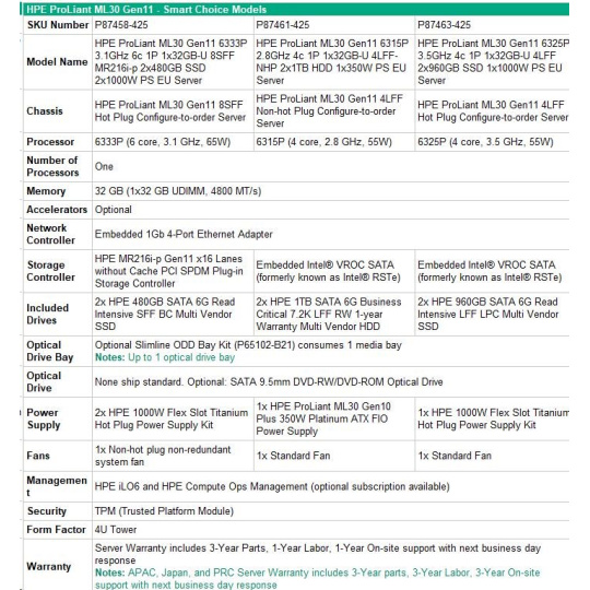 HPE PL ML30g11 6325P (3.5G/4C8T) 1x32G 2x960G SSD SATA 4LFF-HP VROC 1x1000W 4p1G NBD311 Smart Choice.