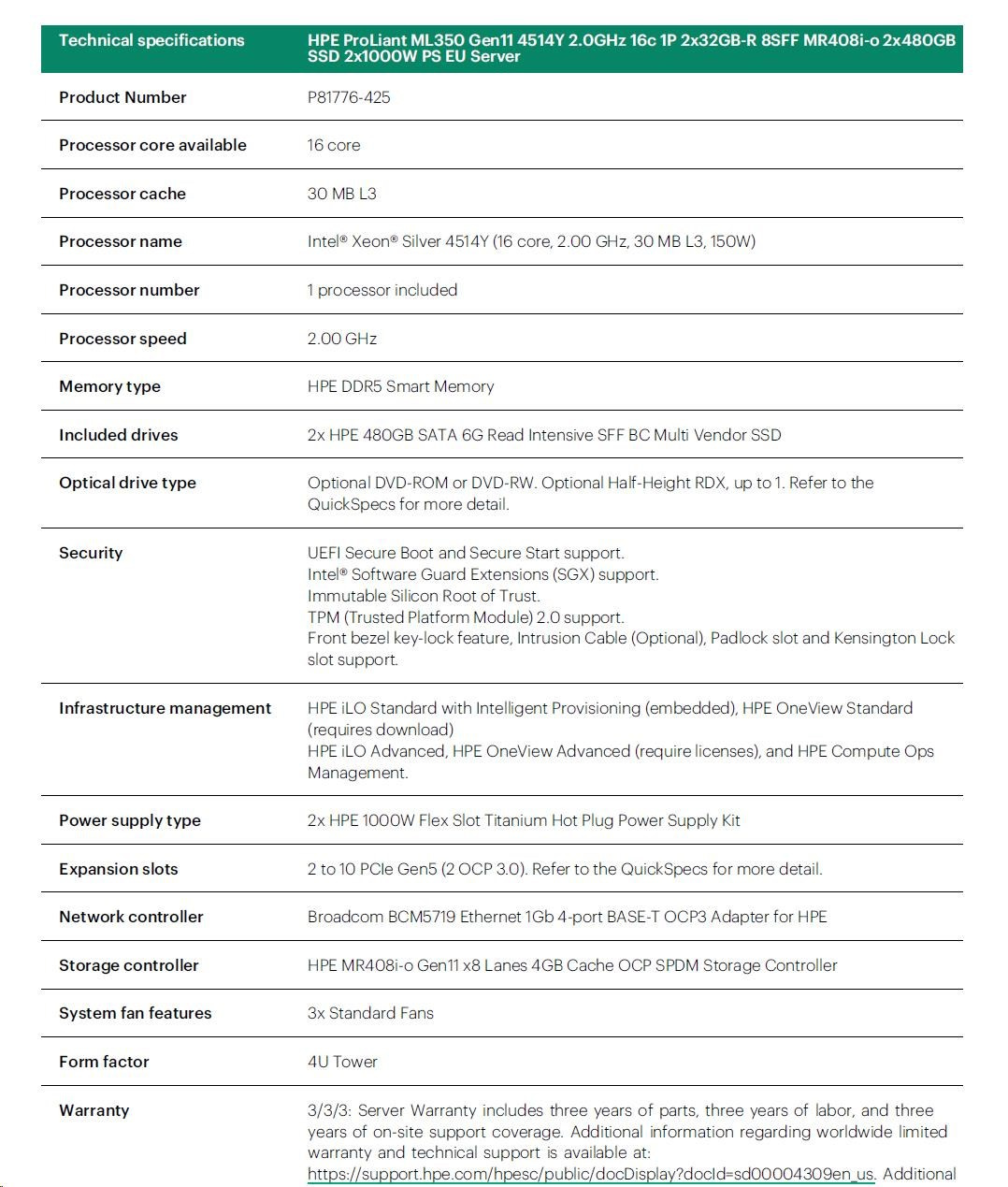 Server warranty includes 3-year parts, 3-year labor, 3-year onsite support with next business day response.