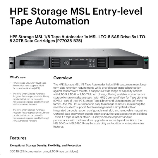 HPE Storage MSL 1/8 Tape Autoloader 1x MSL LTO-8 SAS Drive 5x LTO-8 30TB Data Cartridges.