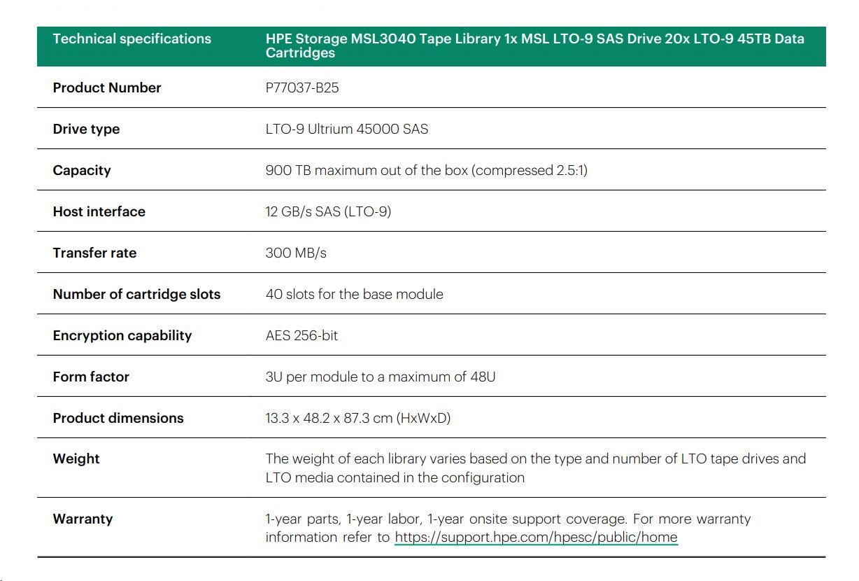 HPE Storage MSL3040 Tape Library 1x MSL LTO-9 SAS Drive 20x LTO-9 45TB Data Cartridges