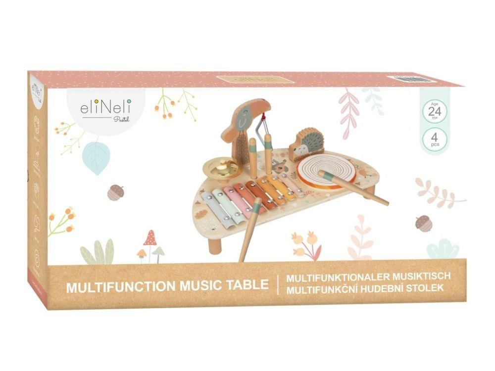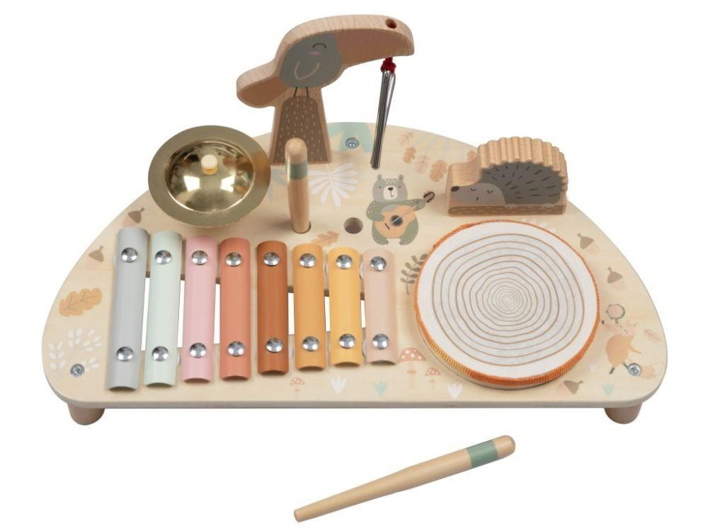Dřevěný hudební stoleček pro děti se sadou 5 hudebních nástrojů na jednom místě, s krásnou malbou a se zvířátky z lesa, probudí lásku k hudbě v každém dítěti. Hudební stoleček obsahuje základní dětské hudební nástroje, které stimulují smysly, zdokonalují jemnou motoriku, seznámí děti s tím, jaké zvuky který nástroj vydává, jak se na něj hraje..