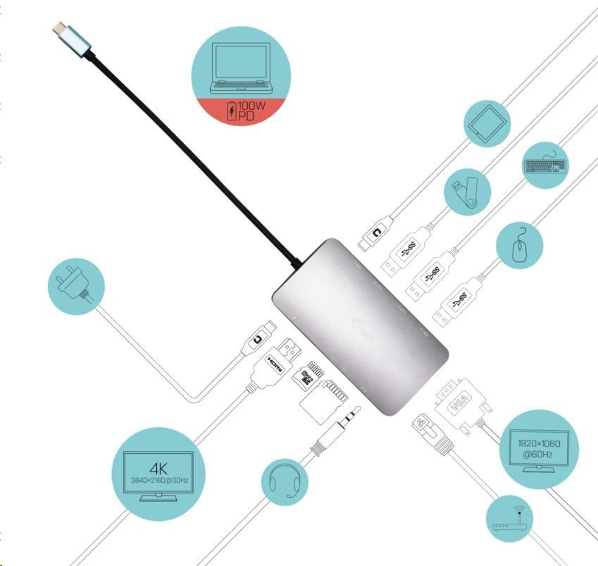 i-tec USB-C Metal Nano Dock HDMI/VGA with LAN + Power Delivery 100W + Charger 100W (bundle)