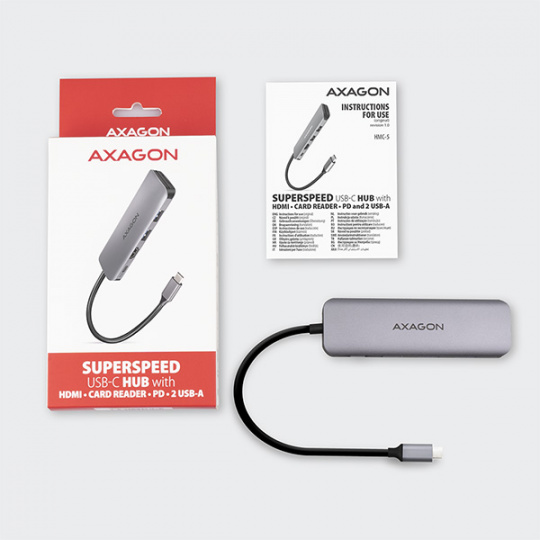 Multiportový USB-C 3.2 Gen 1 hub AXAGON HMC-5 rozšíří Váš notebook, počítač nebo telefon o čtveřici portů a čtečku paměťových karet SD / microSD. Přes oboustranný USB-C konektor snadno a rychle připojíte k počítači dvě USB zařízení, čtečku karet a HDMI zobrazovač současně. Zároveň získáte možnost napájení notebooku pomocí technologie Power Delivery. USB-C hub vám tak poskytne jednoduchou a skladnou dokovací stanici 5v1 k notebooku jako je například MacBook Pro.