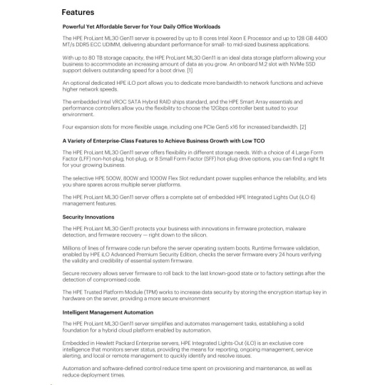 | Chassis | HPE ProLiant ML30 Gen11 4LFF Hot Plug Configure-to-order Server |