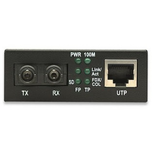Fast Ethernet Media Converter 10/100Base-TX to 100Base-FX (ST) Multi-Mode, 2 km (1.24 mi)  Color: Black  •Data transfer rate: 100 Mbps  •One 10/100Base-TX RJ45 port, maximum distance 100 m / 300 ft.  •RJ45 port with Auto MDI/MDI-X support and auto-negotiation  •One 100Base-FX multi-mode Fiber ST duplex port  •Fiber distance support: up to 2 km / 1.24 mi (62.5/125 or 50/125 µm cable)  •Wavelength: 1310 nm  •Flow control  •Status LEDs for power and Link/TX for both ports  •External power adapter, 5 V DC.