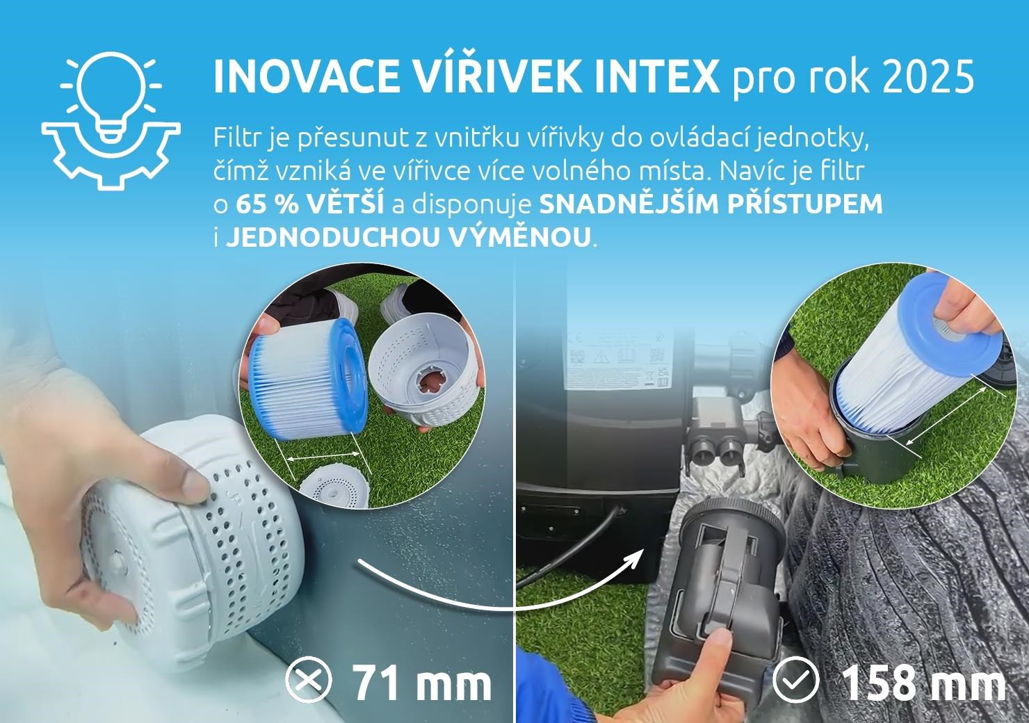 Vířivý bazén Pure Spa Bubble HWS 8 NP je inovovanou verzí modelu Pure Spa Bubble HWS 8. Mezi vylepšení pro rok 2025 patří přesunutí filtru z vnitřku vířivky do ovládací jednotky, čímž vzniklo ve vířivce více volného místa. Filtr nyní disponuje snadnějším přístupem a jednodušší výměnou. Navíc má vířivka nový typ filtrační vložky S2, která vyniká větší filtrační plochou, a to o 65 %. Celkový vzhled vířivky je díky inovacím kompaktnější a lépe vynikne elegantní design.