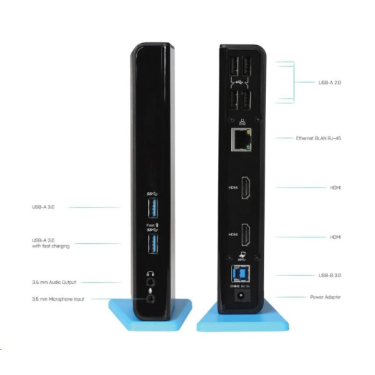 Stanice podporuje až 2x externí monitor, který připojíte díky HDMI portům. 6x USB port, spolehlivé a rychlé připojení k internetu díky integrovanému LAN portu a nechybí ani podpora audio vstupu a výstupu.
