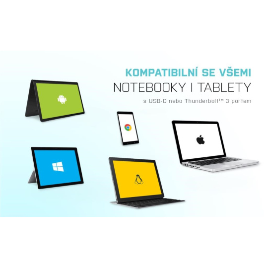 - OS: Vyžaduje USB-C rozhraní s podporou “DisplayPort Alternate Mode” (ne všechna zařízení / systémy s rozhraním USB-C mají tento standard) nebo Thunderbolt 3 port: Windows 10 32/64bit, Mac OS X, Chrome OS (Google)