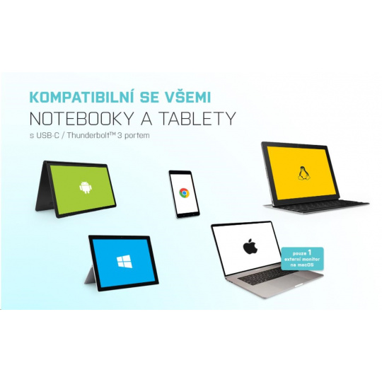 Tato dokovací stanice je navržená tak, že se dá použít s libovolným notebookem, tabletem nebo chytrým telefonem, bez ohledu na typ, značku nebo operační systém. Stačí, aby otebook/tablet/tetefon měl volný Thunderbolt 3 či USB-C port, který umí přenášet video signál.