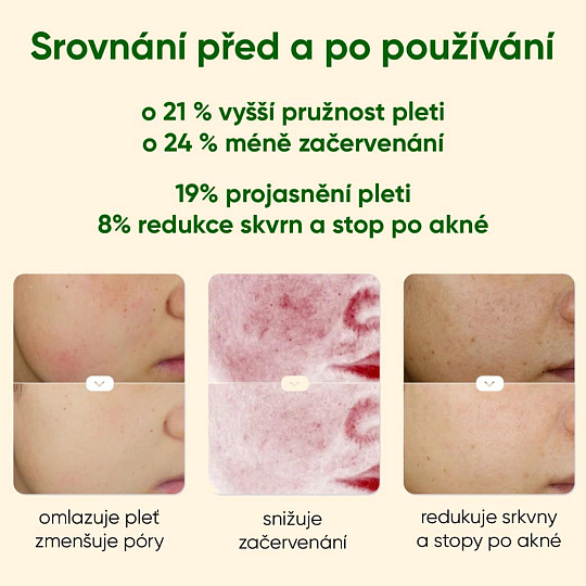 - Bojuje proti stárnutí: Vyhlazuje vrásky, stahuje rozšířené póry a prokazatelně zvyšuje produkci kolagenu a elastinu, čímž navrací pleti pevnost a pružnost.