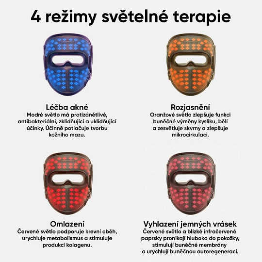 - Čtyři klinicky ověřené vlnové délky pro komplexní péči o pleť: modrá, jantarová, červená a blízká infračervená.