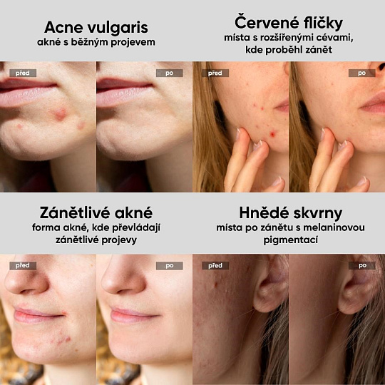 - Prevence návratu akné: Cíleným působením na příčinu vzniku akné (bakterie a maz) efektivně snižuje riziko jeho opakovaného výskytu.