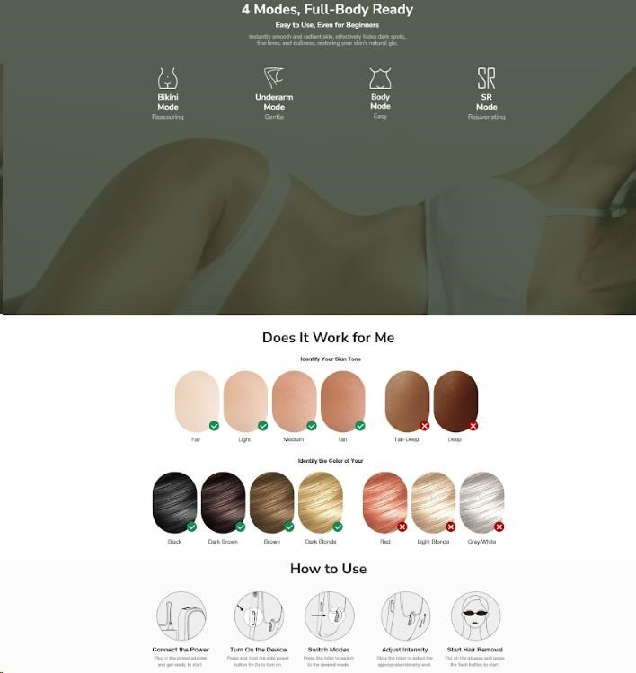 - Cílená péče pro celé tělo: Několik režimů a úrovní intenzity pro bezpečné ošetření nohou, rukou, podpaží, oblasti bikin i obličeje.