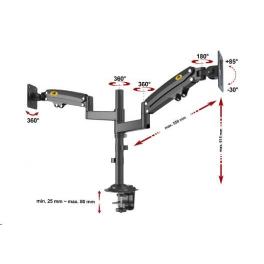 Monitorový držák na okraj stolu nebo do prostoru stolové desky, 19-32", otočný, sklopný, výsuvný, duální výškové polohování, pivot, systém pro uspořádání kabeláže, nosnost 18kg.