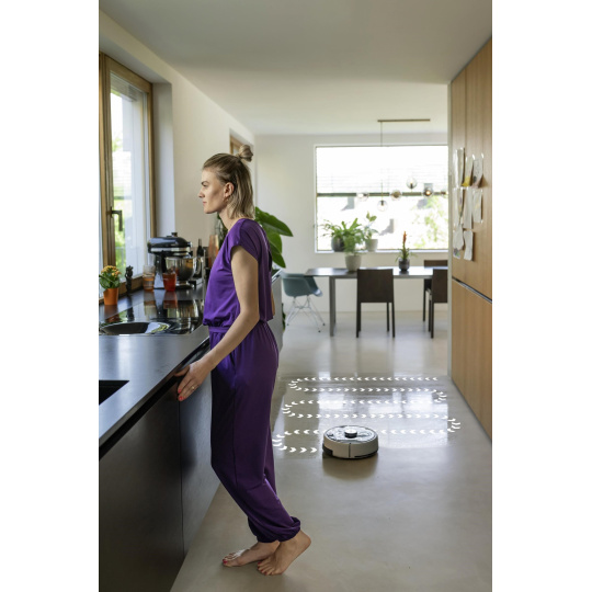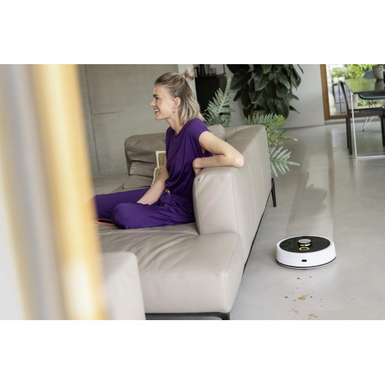 Podlahy vyčistíte stisknutím jediného tlačítka: chytrá robotická myčka RCF 3 se od nynějška postará o jinak únavné a časově náročné vytírání tvrdých podlah. Díky osvědčené technologii válce odstraňuje RCF 3 nejen odolnou špínu nebo zaschlé tekutiny, ale také sbírá prach a drobné nečistoty. Přitom automaticky rozpozná koberce a obratně se jim vyhne. RCF 3 má dvě nádrže, které mu umožňují neustále zvlhčovat čisticí válec čistou vodou a zvlášť sbírat nečistoty do nádrže na špinavou vodu. Také lehké, suché nečistoty se snadno zachytí a dopraví do nádrže na špinavou vodu. Pomocí praktického ovládání aplikace lze nastavit různé režimy čištění. Robota tak lze velmi flexibilně přizpůsobit nejrůznějším potřebám a požadavkům. Pro úklid se robot pohodlně spouští prostřednictvím aplikace nebo stisknutím tlačítka na zařízení. Pokud RCF 3 potřebuje pomoc, sdělí vám to hlasovým výstupem nebo prostřednictvím aplikace. Je doporučeno umístit nabíjecí stanici na povrch, který není vyroben ze dřeva, aby se předešlo riziku poškození dřevěné podlahy vlhkým válcem při parkování robota ve stanici po dokončení čištění.