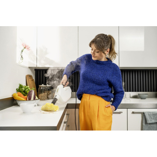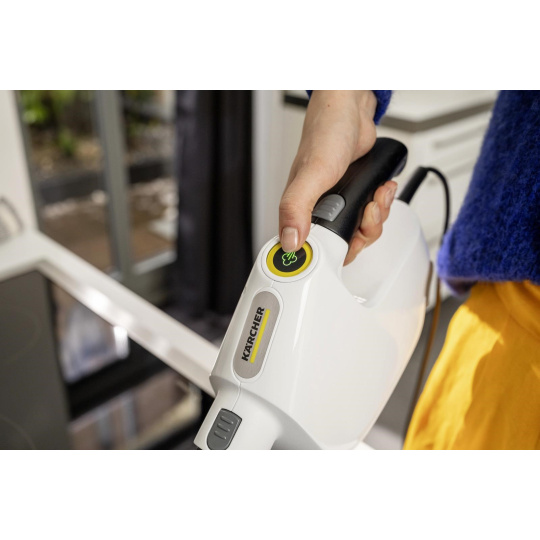 Kompaktní parní mop SC 1 Multi & Up čistí bez použití chemikálií a lze jej v mžiku použít k hloubkovému úklidu celého domu, a to buď jako multifunkční ruční parní čistič, nebo jako všestranný parní mop 3 v 1 díky sadě velkých podlahových hubic EasyFix, která je součástí balení. Pracuje ve třech různých polohách zařízení - horní, střední a dolní - a dokonale se přizpůsobí individuálním požadavkům. Důkladné čištění parním čističem Kärcher odstraní z tvrdých povrchů až 99,999 % virů* a 99,99 % všech běžných domácích bakterií**. Díky kompaktnímu a praktickému designu se přístroj pohodlně používá a snadno se skladuje i v těch nejmenších prostorách. SC 1 Multi & Up je připraven k použití během 30 sekund a díky odnímatelné nádržce na vodu se snadno doplňuje - to znamená, že nemusíte dlouho čekat ani přerušovat práci. Vyměnitelná odvápňovací kazeta zajišťuje automatické odstraňování vodního kamene, čímž je životnost výrobku pětkrát delší. Světelný LED displej s ovládacím panelem umožňuje jednoduché a bezproblémové ovládání. Na displeji jsou vždy zobrazeny různé režimy, jako je ohřev, připravenost k použití, parní režim a termín výměny patrony.