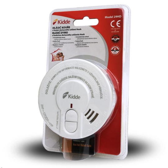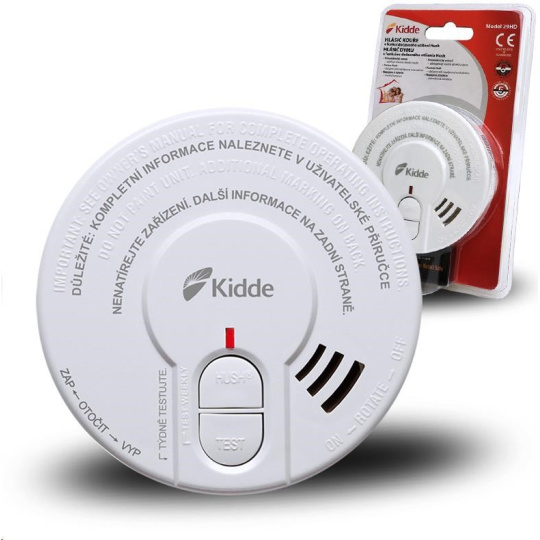 Hlásič požáru je vybaven testovacím tlačítkem TEST pro kontrolu správného fungování zařízení a HUSH pro přechodné umlčení požárního hlásiče pro případ planého alarmu. Stisknutí tlačítka způsobí okamžitou deaktivaci alarmu, na dobu asi 10minut, snížení citlivosti obvodů a vypnutí akustické signalizace hlásiče. Tlačítko HUSH používejte pouze tehdy, pakliže znáte příčinu aktivace hlásiče (např. při vaření nebo smažení). Po cca 10 minutách od deaktivace hlásiče se tento zcela automaticky resetuje do původního nastavení pro monitorování nebezpečí požáru. Pokud v místnosti zůstane vysoká koncentrace kouře, můžete stisknout tlačítko HUSH opakovaně a to až do okamžiku kdy je místnost řádně odvětrána. Tento model je vybaven nejmodernějším fotoelektrickým senzorem Kidde.