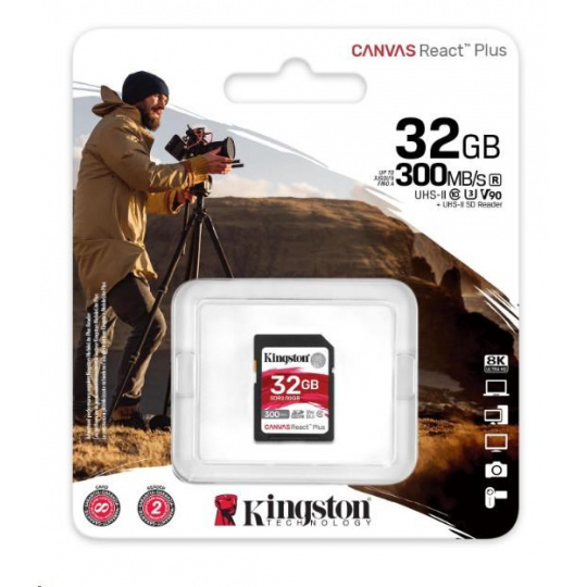 Kingston SDHC karta 32GB Canvas React Plus SDHC UHS-II 300R/260W U3 V90 for Full HD/4K/8K