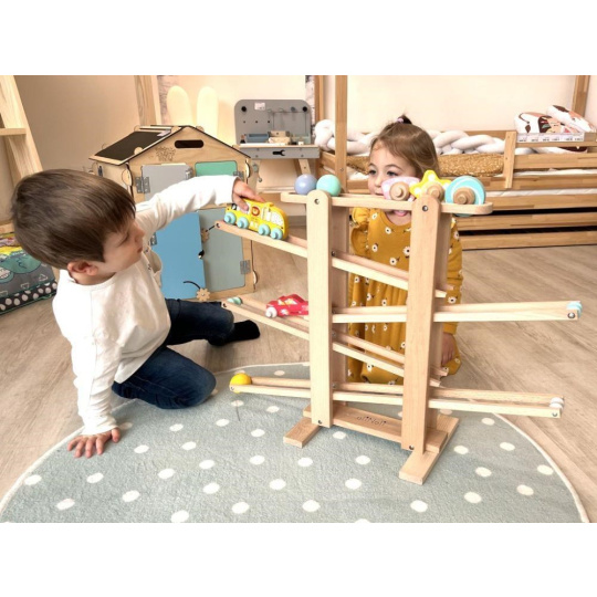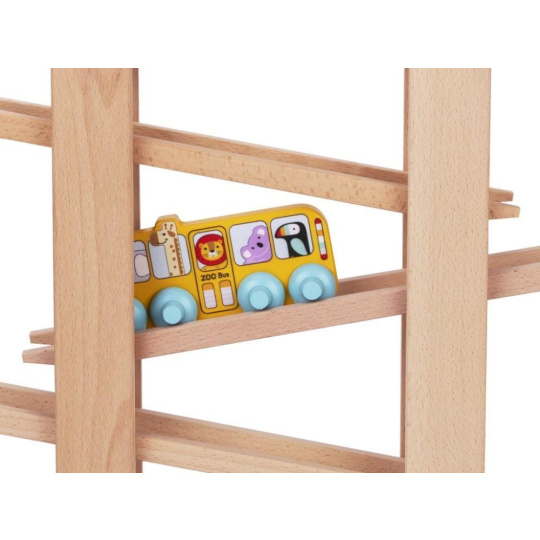 Dřevěná kuličková dráha XL s originálními prvky v podobě parádního závodního autíčka a autobusu se zvířátky ze ZOO ZDARMA nadchne každé dítko. Kuličková dráha z tvrdého přírodního dřeva se 7 zábavnými prvky v krásných barvách zajistí zábavu nejen vaší holčičce nebo chlapci, ale i celé rodině. Stačí správně umístit kuličku, květinu, závodničku nebo bus na začátek dráhy a pak jen sledovat, jakou rychlostí zdolá všechna patra..