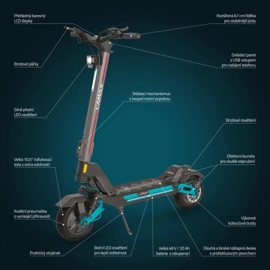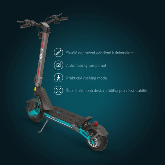 Všechny údaje o jízdě uvidíš za každého počasí nebo klidně i v noci na velkém LCD displeji, rozhodně ti proto neunikne, kolik šťávy zbývá nebo jakou máš rychlost. Hravě přes něj koloběžku pomocí 3místného PIN kódu i zabezpečíš proti krádeži. Jsou úseky, kde se můžeš kochat okolím a neřešit rychlost, tu hlídá tempomat. Když je rychlost konstantní, automaticky se aktivuje. Bezpečnou jízdu za jakýchkoliv podmínek podporuje LED osvětlení celé koloběžky, kdy díky LED světlu, bočním barevným světlům a zadnímu integrovanému budeš nepřehlédnutelný. Když s tebou jde kámoš a klábosíte nebo se ti nechce do prudkého kopce koloběžku tlačit, aktivuj Walking Mode, který popojíždí pomalým tempem max. 6 km/h. Koloběžka tě zachrání i tehdy, když máš vybitý mobil, stačí využít USB vstup pro nabíjení. Pokud potřebuješ svoji mašinu přenést nebo uskladnit, během 3 sekund ji pomocí inovativního mechanismu složíš. Jen počítej s tím, že váží 35 kg.