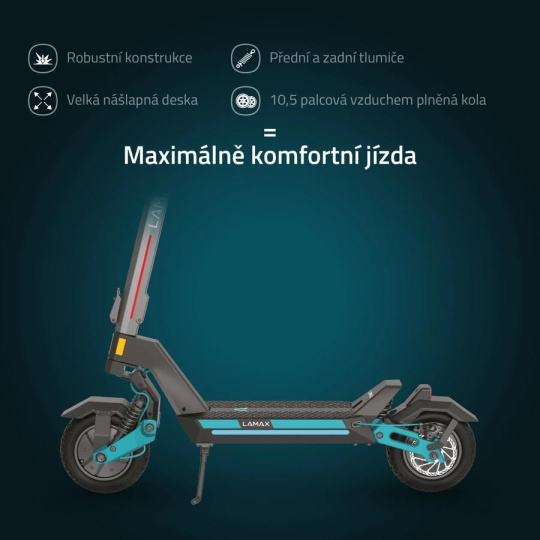 Tohle není obyčejná jízda, při téhle se skoro vznášíš, protože každá část koloběžky je do detailu promyšlená. Už jen velká 10,5“ vzduchem plněná kola s?extra vyztuženým pláštěm odolným proti defektům zaručují pohodlnou jízdu i po dlažebních kostkách, a perfektní stabilitu a přilnavost, kterou oceníš hlavně při brždění, ale i v zatáčkách. Jízdní komfort ještě podporuje přední i zadní odpružení spolu s vyztuženým zadním blatníkem, který nevydává rušivé zvuky. Ještě důležitější je bezpečnost, o kterou je postaráno díky ochraně proti nechtěnému rozjezdu, což znamená, že elektromotor sepne až po dosažení určité rychlosti. Samozřejmostí je také trojitý brzdný systém, kde kvalitní zadní a přední kotoučové brzdy spolu s elektronickou brzdou zkracují brzdnou dráhu. Dokonalý požitek z jízdy umocňují rozšířená řídítka, která společně s dostatečně širokou a dlouhou nášlapnou deskou poskytují dokonalou jízdní stabilitu a bezpečnost.