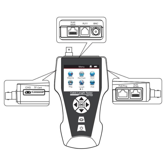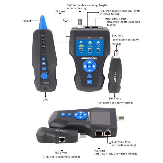 Pokročilý tester pro testování a diagnostiku různých typů kabelů/vedení. Využívá technologii TDR (Time Domain Reflectometry) k přesné lokalizaci a identifikaci závad ve vedení. Zařízení je vybaveno velkým LCD displejem, který zobrazuje všechny patřičné informace a podporuje vícejazyčné nastavení. Kromě toho je vybaven vestavěným tónovým generátorem a funkcí vyhledávání portů, takže je ideální pro testování síťových kabelů, telefonních linek a videokabelů.