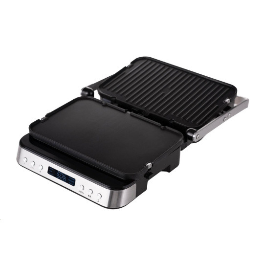 Kontaktní gril na zapékání, který po uvedení do vodorovné polohy přetvoříte na plnohodnotný stolní gril o ploše 1400 cm2.