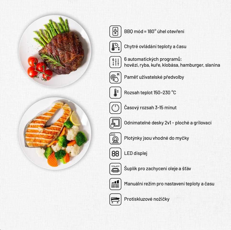 Gril nabízí 6 automatických programů, které jsou na míru ušité různým surovinám. Teplotu i čas přípravy můžete nastavit také manuálně, gril si vaší volbu zapamatuje a můžete ji využít i příště.